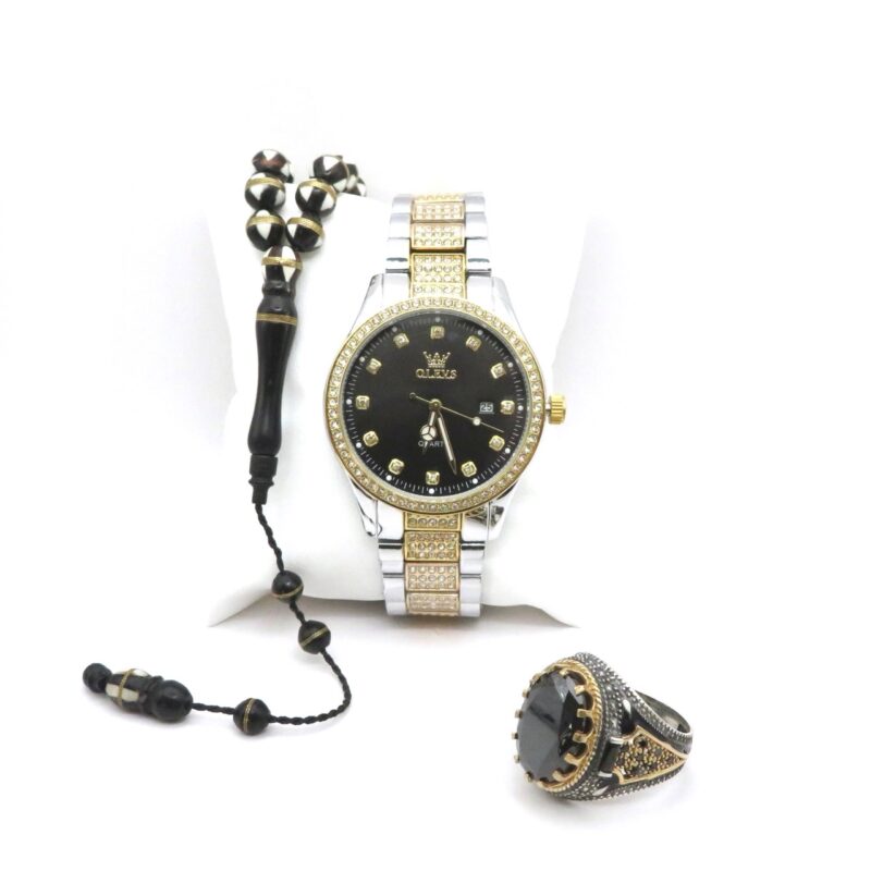 قبل نصف ساعة مجموعة رجالية: خاتم من الفضة الاسترلينية عيار 925، وساعة Elements الفاخرة، ومسبحة Fatura المكونة من 33 حبة. - مجموعة ميراج للرجال – أسود