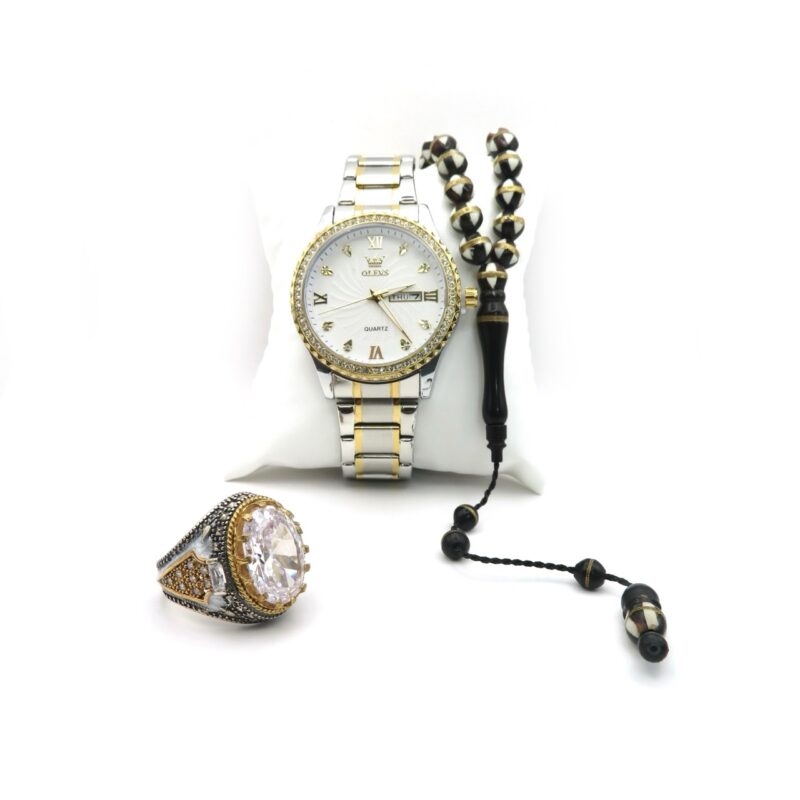 مجموعة "الرجال السماويون" مستوحاة من تناغم الكون، وتضم ساعة OLEVS ذهبية وفضية، وخاتمًا يمنيًا أبيض نقيًا،
